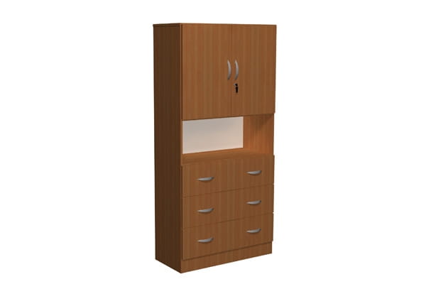 - Posiada 2 przestrzenie na dokumenty zamykane szafką, 1 otwartą półkę i 3 szuflady.