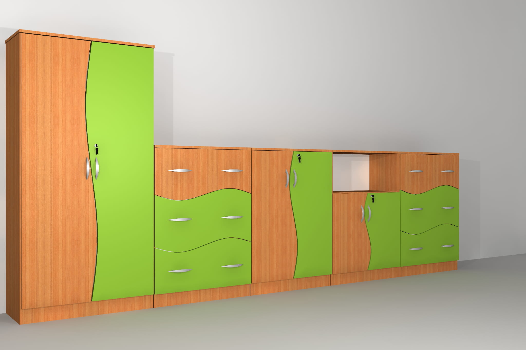 - Wymiar wysokiej szafy FALA nr 1 (WxSxG) 1850x900x400 mm, wymiar pozostałych szafek 1150x800x400 mm.
