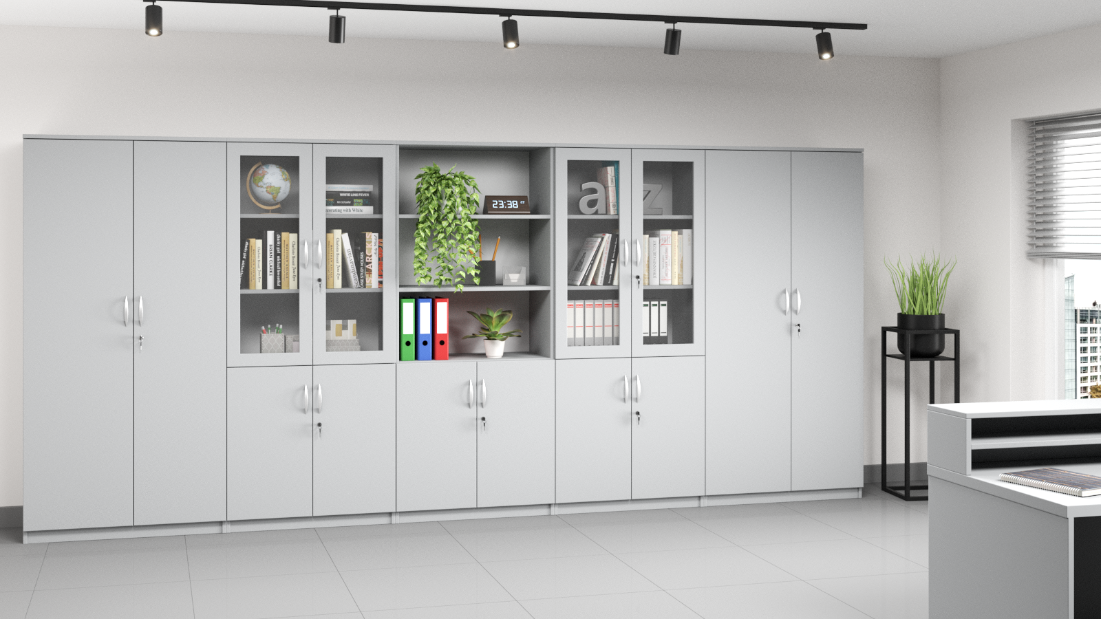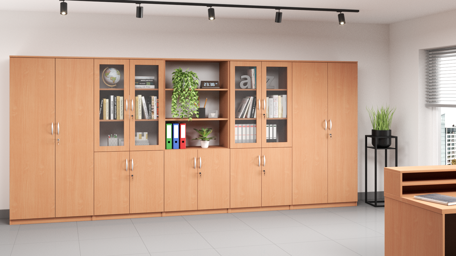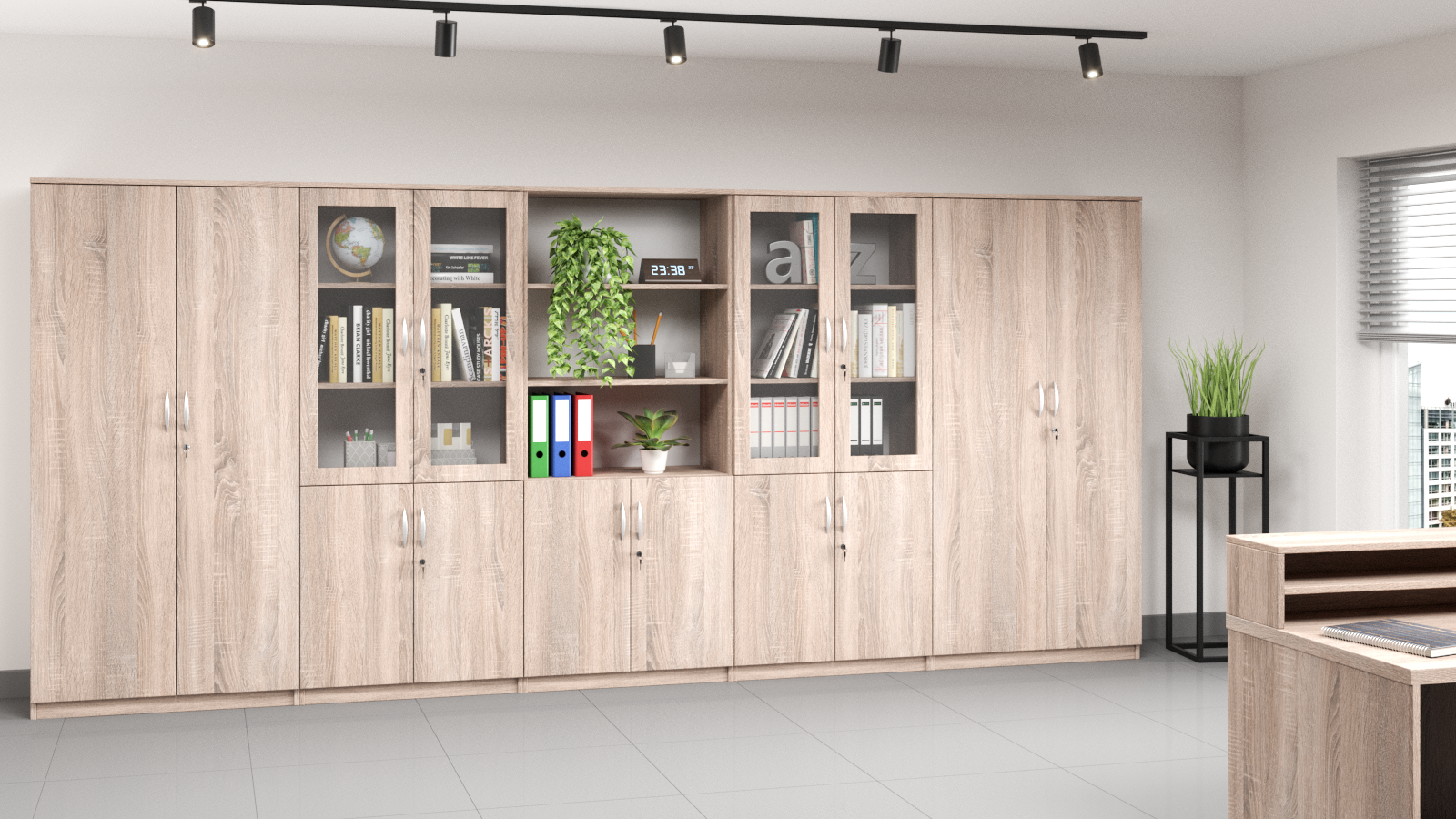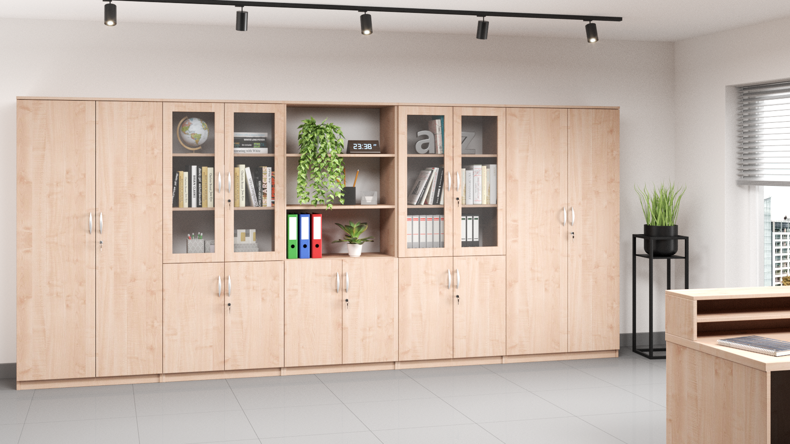 * Mazur 26 Wymiar (WxSxG) 1850x800x400 mm. Wykonana z płyty laminowanej 18 mm. Posiada 5 przestrzeni na dokumenty. Trzy górne zamykane drzwiami z witryną i dwie dolne pełnymi drzwiami. Drzwi zamykane na zamek z 2 kluczykami. Istnieje możliwość zamontowania zamków z system klucza MASTER. Metalowe uchwyty.