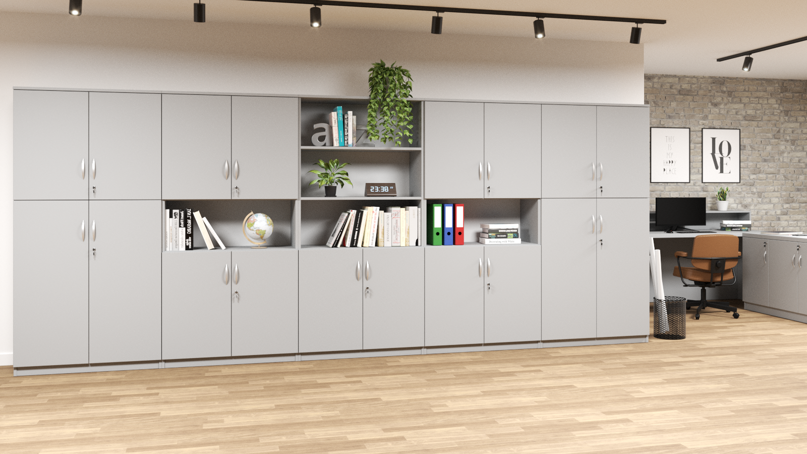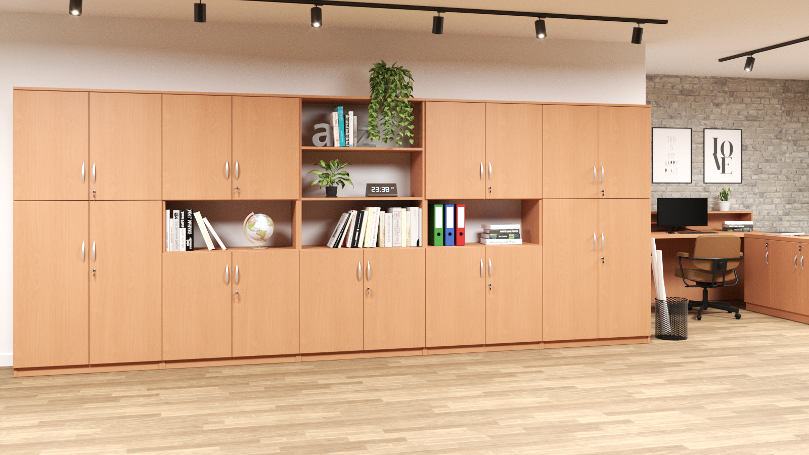 * Kujawiak 6 Wymiar (WxSxG) 1850x900x400 mm. Wykonany z płyty laminowanej 18 mm. Posiada 5 przestrzeni na dokumenty. 3 półki otwarte, 2 zamykane drzwiami na zamek z dwoma kluczami. Istnieje możliwość zamontowania zamków z system klucza MASTER. Metalowe uchwyty.